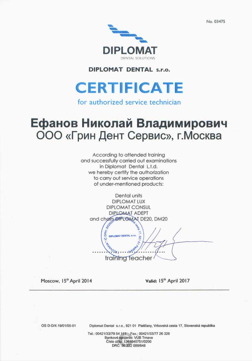 Инженер компании ООО «ГРИН ДЕНТ СЕРВИС», Ефанов Николай Владимирович, успешно прошел тренинг по ремонту и обслуживанию стоматологических установок DIPLOMAT.