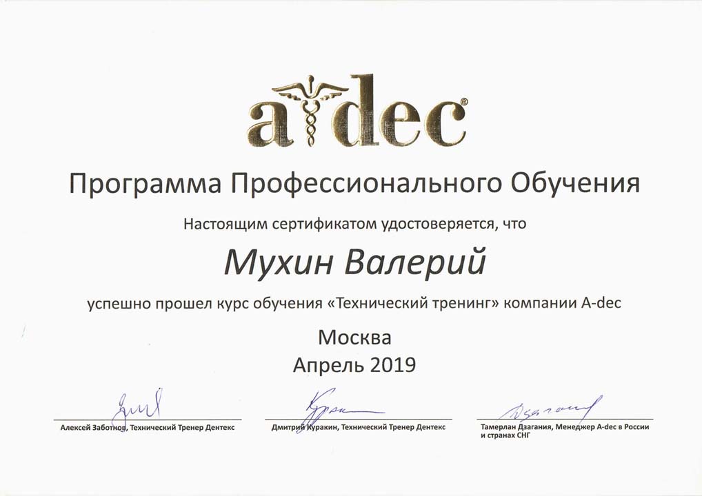 Инженер компании ООО «ГРИН ДЕНТ СЕРВИС», Мухин Валерий Владимирович, успешно прошел тренинг по ремонту и обслуживанию стоматологических установок A-dec.